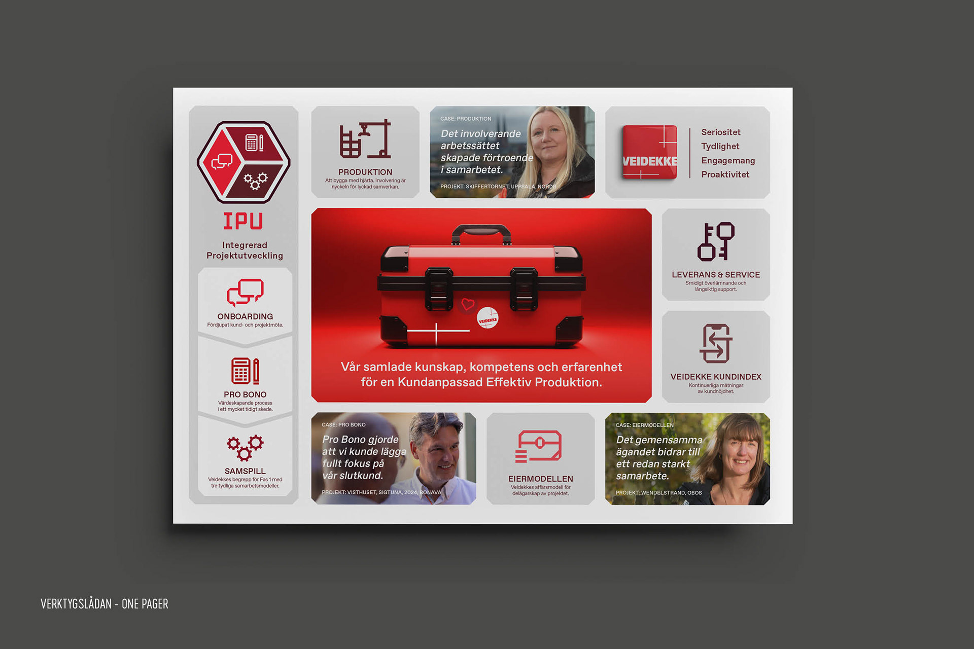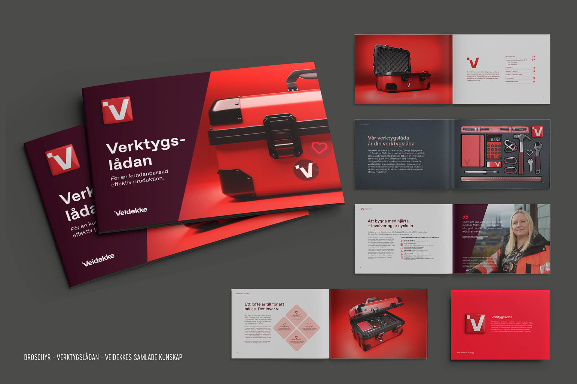Veidekke är en av Skandinaviens ledande aktörer inom bygg och infrastruktur, med en lång tradition av att utveckla projekt som skapar värde för både människor och samhälle. Uppdraget handlade om att samla och tydliggöra Veidekkes erbjudande i en mer mänsklig och begriplig form – ett verktyg som stärker förståelsen för helheten, både internt och externt. Resultatet blev en visualisering och beskrivning av ”verktygslådan”, att använda i interna utbildningar, säljmaterial och kunddialoger. Ett sätt att bygga stolthet och en gemensam bild av vad Veidekke faktiskt kan – och vill.